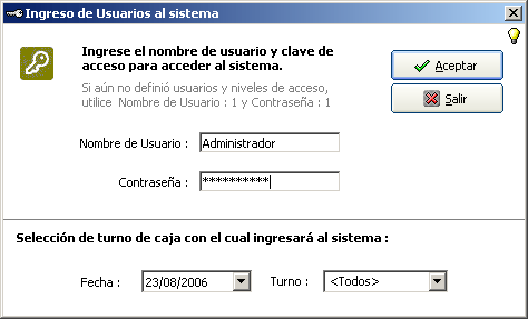 4.24 - Ingreso / Cambio de Log de Usuario actual Acceso Desde: Barra de Botones : ![]() Barra de Menús : No Posee Permite: Registrar la entrada al sistema por un usuario del mismo o cambiar de usuario de uso sin salir de ActualHotel!. Cada usuario posee su nombre de acceso y contraseña como así también su juego de privilegios o nivel para operar dentro del sistema. Dependiendo de que forma esté configurado el sistema de turnos de caja, en la parte inferior se presentan dos datos de verificación a completar (fecha y turno correspondiente). Esto permite colocar la gestión que el usuario desarrolle en el turno correspondiente.