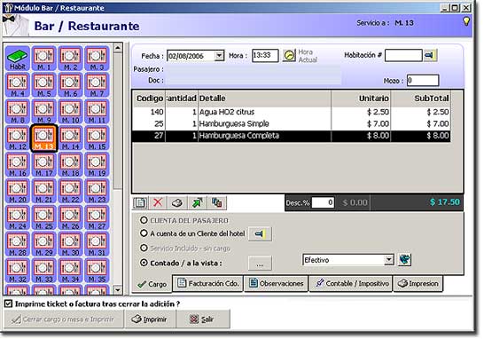 ActualHotel! incorpora un modulo de administración de consumos de servicios de bar y restaurante. Pueden crearse varias terminales para cada una de las dependencias.