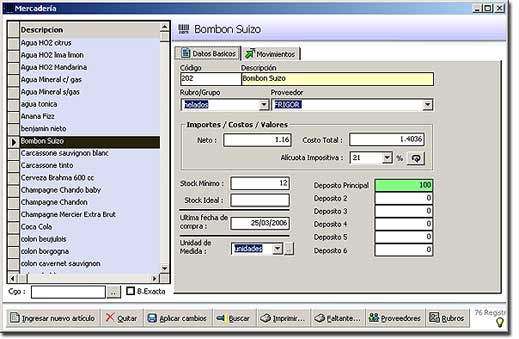 Esta pantalla gestiona los artículos de mercadería o materia prima, sus movimientos, control de stock, minimos, etc.