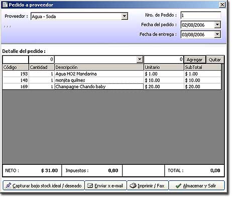 Desde ésta pantalla se ingresan los pedidos de compra los que se puede enviar automaticamente por e-mail y registrar para hacer comparativas de diferencias de precios.