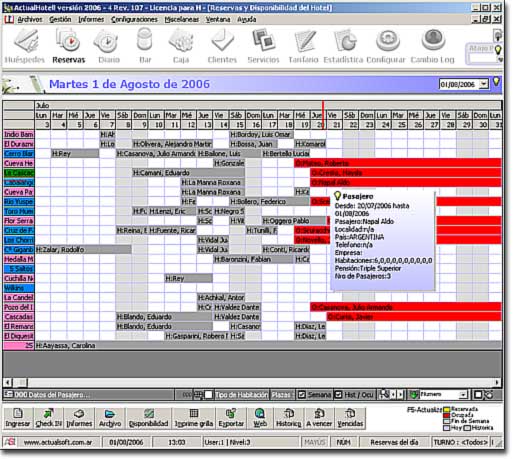 Ésta pantalla totalmente gráfica, intuitiva y dinámica, administra las reservas del hotel. Con colores identificativos, se distingen las referidas a clientes específicos, al sobrevolar por ellas se despliega mas información. Abajo se encuentra una botonera completa con opciones de manejo muy sofisticadas.