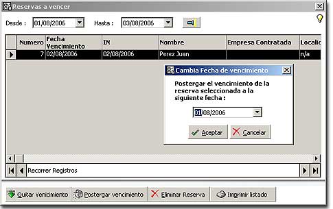 Se puede desde esta ventana administrar las reservas que estan por vencer o caer para actualizar los datos de fechas, postergar caida, emitir informes, etc.