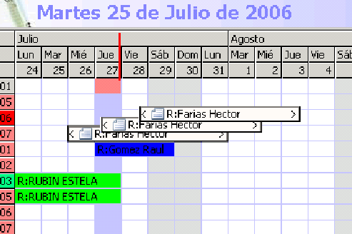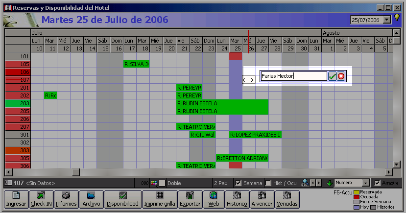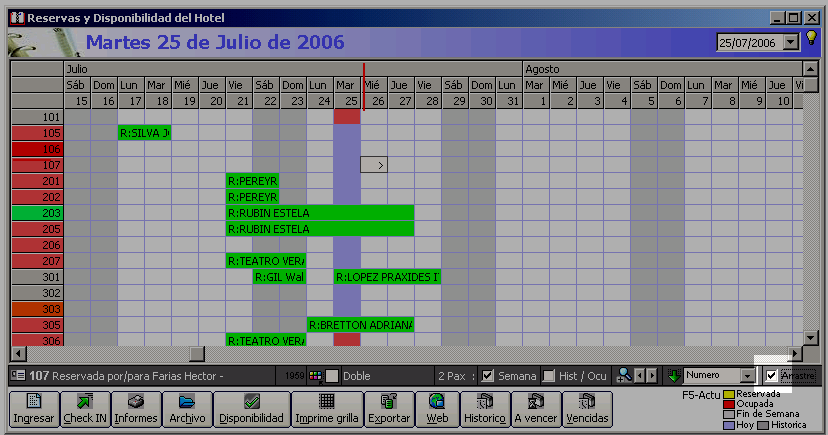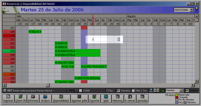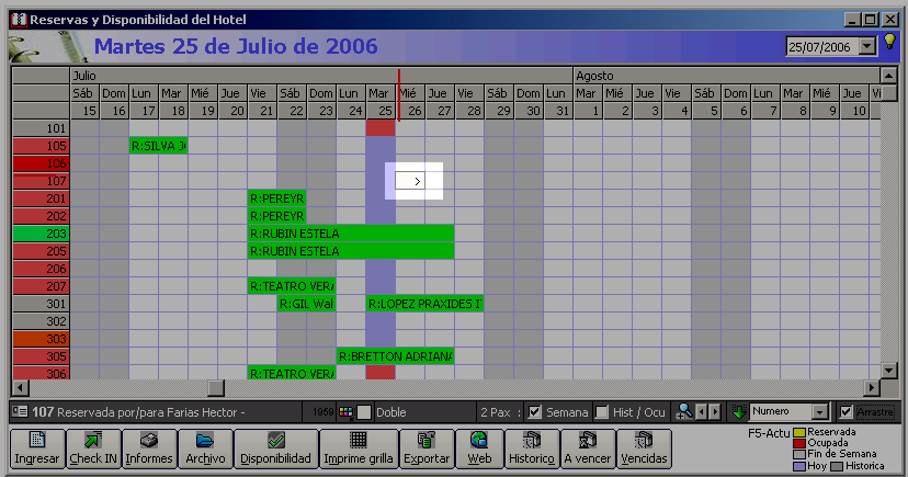 Al hacer click sobre la coordenada Habitación/ Fecha; el sistema mostrará la reserva o los datos del pasajero alojado según corresponda. Fíjese que al pasar el puntero del mouse sobre un rectángulo,