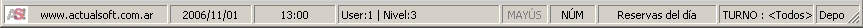 La "Barra de estado" al pie de la ventana donde podemos consultar datos básicos del sistema tales como la fecha, hora, el usuario actual del sistema, el Turno en funciones actual, el nivel de acceso que este posee, el estado de teclas habilitadores del teclado, sobre que deposito se esta trabajando con predeterminado para la incidencia de Stock, y la dirección para visitar el sitio Web de ActualSoft!.
